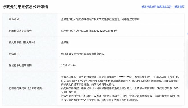 2月7日,据浙江政务服务网显示,演员金晨因交通肇事逃逸被罚款1500元。