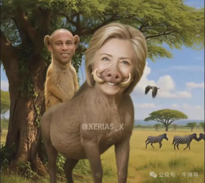 这段特朗普支持者AI制作的视频中,还有很多让人哭笑不得的形象,比如,希拉里被描绘成了疣猪、拜登成了猴子、哈里斯是乌龟,而特朗普,则是威风凛凛的丛林之王——狮子。