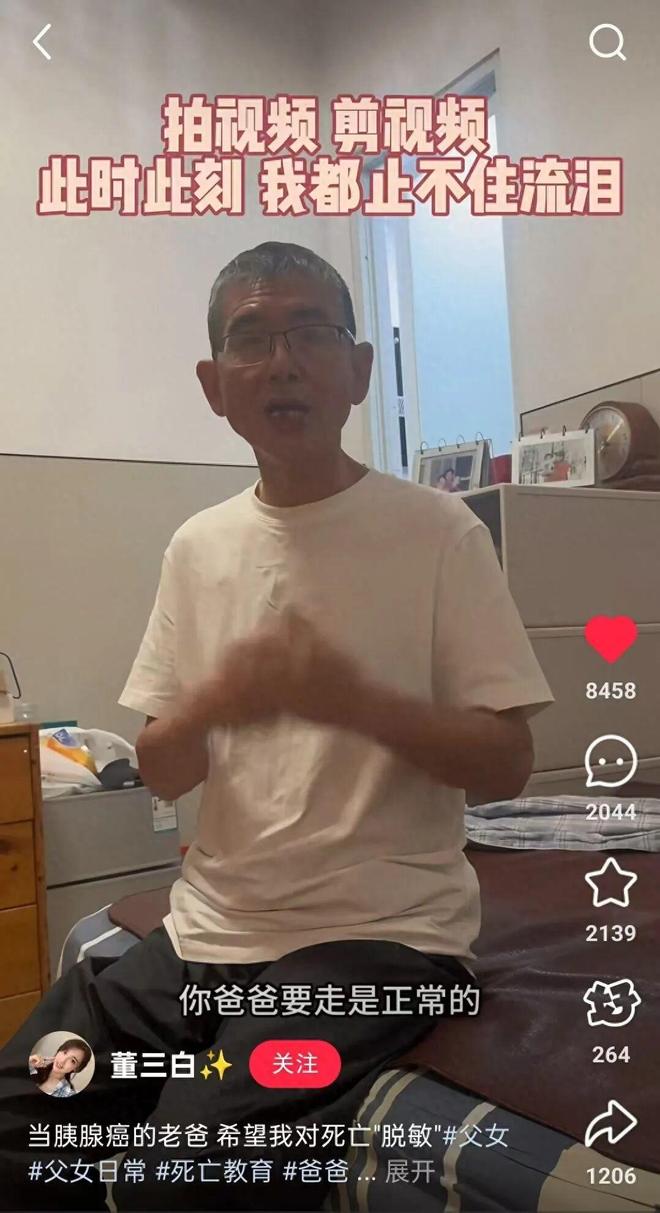 去年10月,胰腺癌患者董先生向女儿董三白(化名)讲述自己对死亡的看法,称“死亡是人生必经的过程”,劝慰女儿不要过于悲伤。董三白将这段对话上传到网络后,其父从容的讲述与豁达的态度使得视频广为传播。