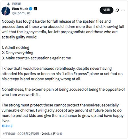 马斯克还说:“被指控为与自身品格截然相反的人,这种痛苦虽然剧烈,但为了保护弱势儿童,一切都是值得的。”马斯克认为:“强者必须挺身保护无法自保的人,为了让孩子们有机会平安长大并拥有幸福生活,他愿意承担未来任何程度的诋毁与伤痛。”