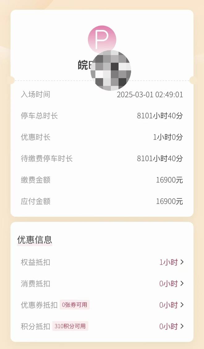 网传图片显示,这辆黑色的皖牌宝马四周都是围栏,后窗上还贴有一张纸,上面写着:“移车请联系水晶城消控24小时值班电话……”而另一张图片上可见,该车入场时间是2025年3月1日凌晨2点多,停车总时长达到8101小时,缴费金额为16900元。
