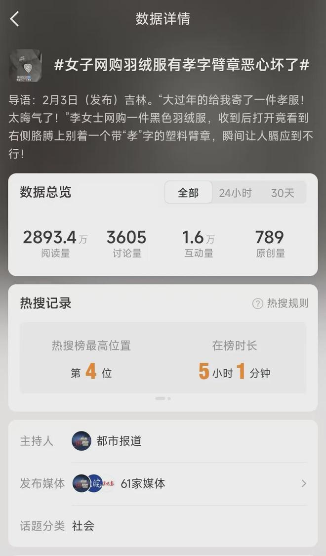 近日,李女士网购的羽绒服衣袖上出现“孝”字臂章,立马引发关注,登上微博热搜。