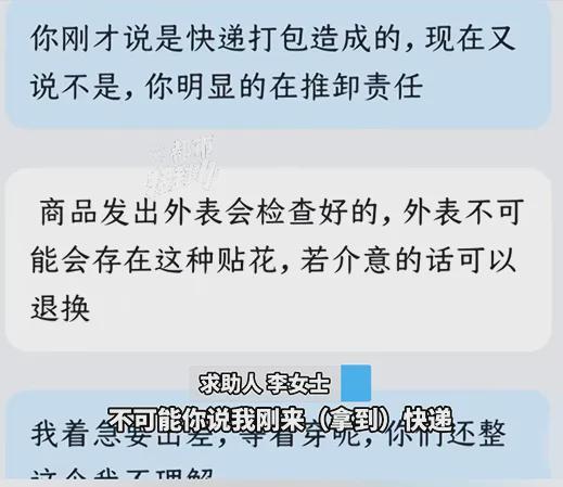 此外,客服一开始承认这种情况可能是打包造成的,但后来却又改口,声称所有商品都是检查完才发货,不可能存在贴字的情况。而对于李女士要求提供打包监控视频的诉求,商家表示会尽快回复。
