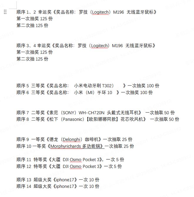 年会奖品分为幸运奖、三等奖、二等奖、一等奖、特等奖和超级大奖,分别为500份蓝牙鼠标、100份电动牙刷和100份手环、50份无线耳机和50份吹风机、25份咖啡机和25份多功能锅、10份大疆云台相机、20份iPhone17。