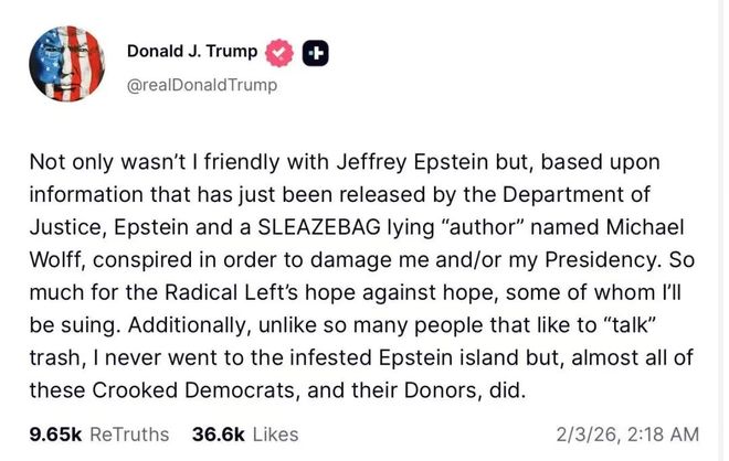 美国总统特朗普2日在社交媒体上发文,再次否认与美国已故富商爱泼斯坦的案件有关联,称从未去过爱泼斯坦的岛屿。